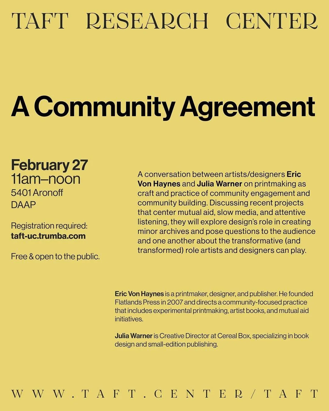 Eric Von Haynes is a printmaker, designer, and publisher, and founder of Flatlands Press (2007–present). His work spans experimental printmaking, artist books, collaborative publishing, and mutual aid initiatives.